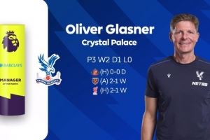 格拉斯纳执掌的水晶宫在九月保持不败,将各项赛事连续不败纪录扩大到19场。球队月初与桑德兰0-0战平,随后客场2-1力克西汉姆联,并在月末戏剧性绝杀利物浦,成为当月英超唯一保持不败的球队。