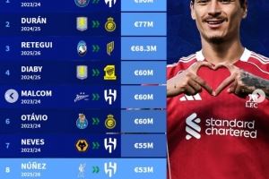 8.努涅斯 2025/26赛季 从利物浦加盟利雅得新月 5300万欧